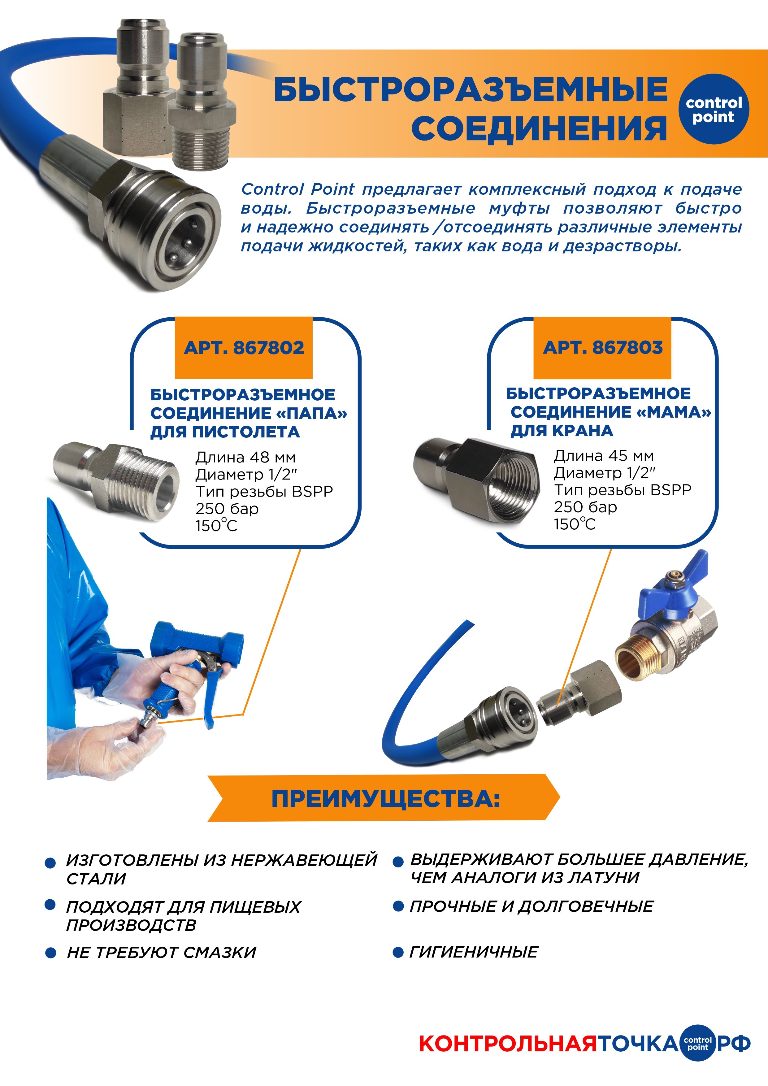Быстроразъёмное соединение CONTROL POINT “папа” используется в профессиональных системах водоснабжения, санитарной мойки и технического обслуживания оборудования. Оно незаменимо на: