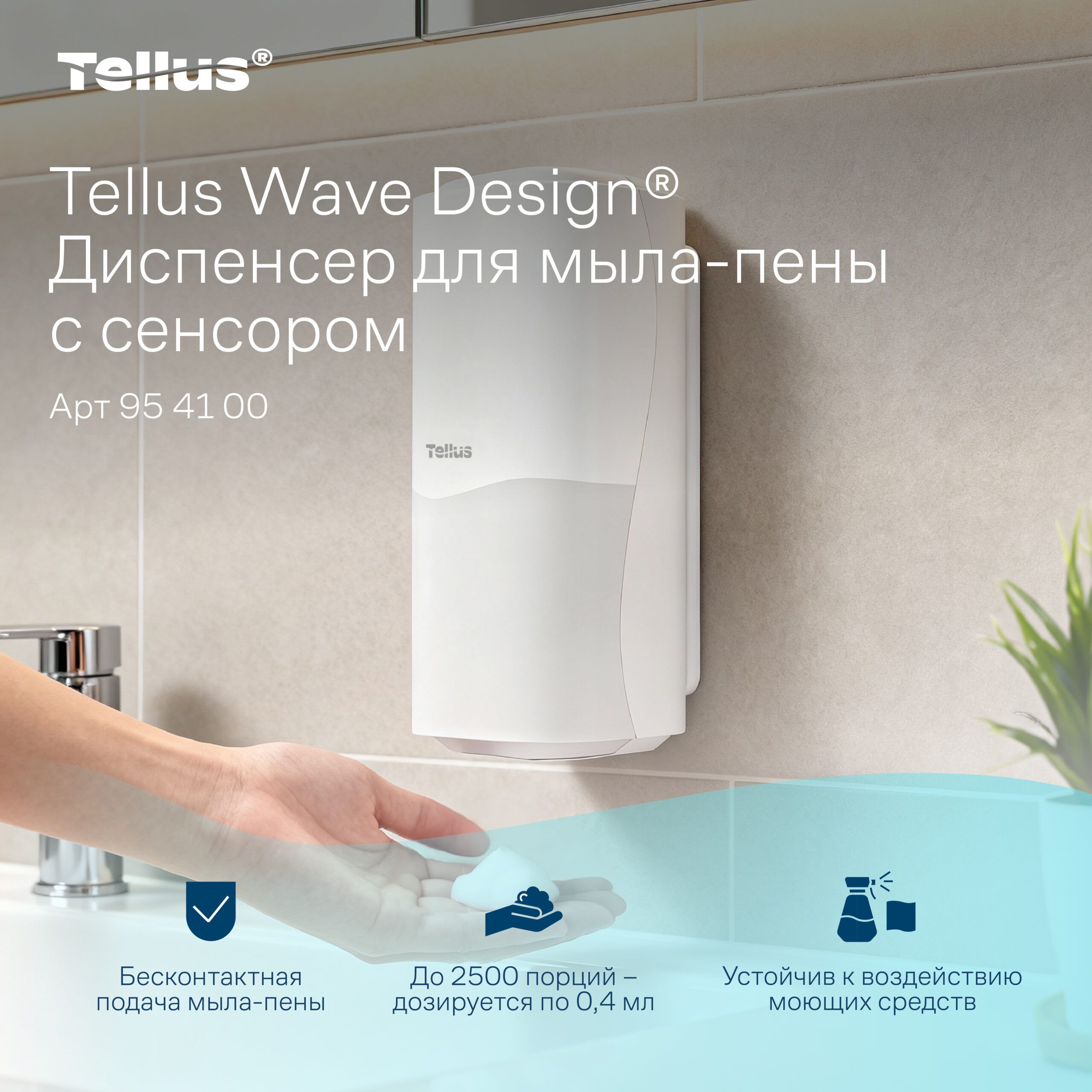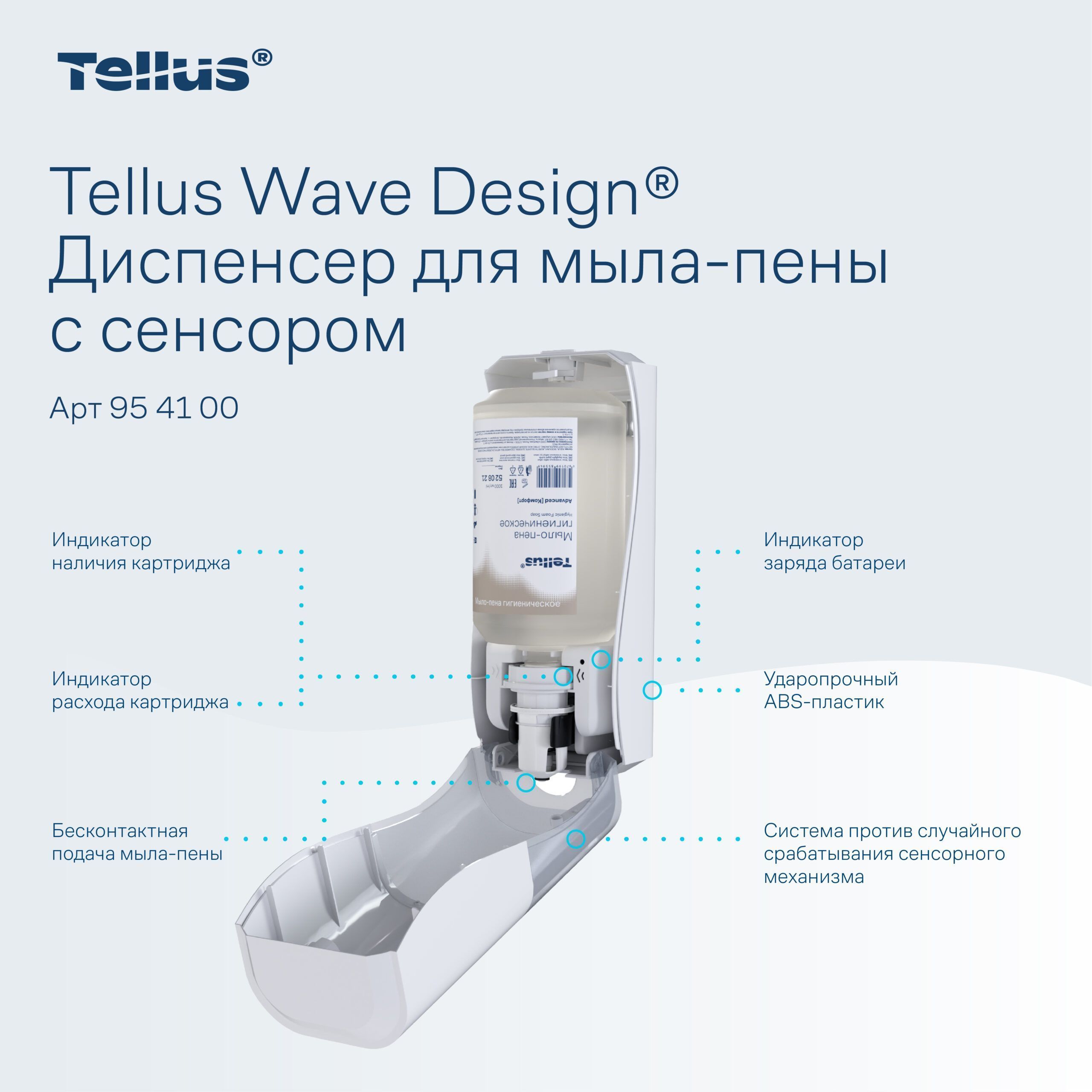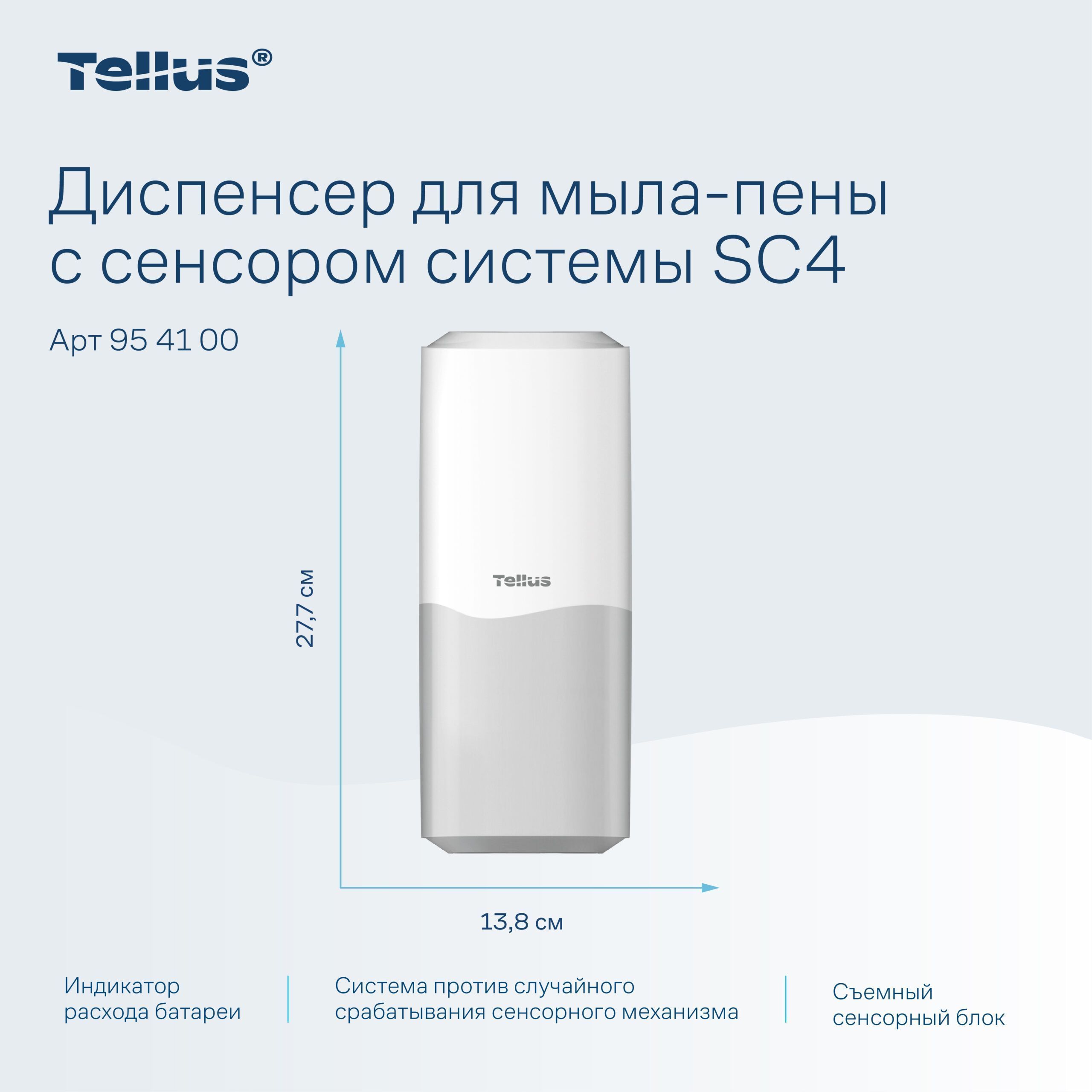 Сенсорный диспенсер Tellus SC4 954100 — современное профессиональное оборудование для поддержания высокого уровня гигиены в санитарных помещениях различного назначения. Устройство предназначено для автоматической подачи вспененного мыла без контакта с корпусом, что значительно снижает риск перекрестного загрязнения и повышает санитарную безопасность пользователей.