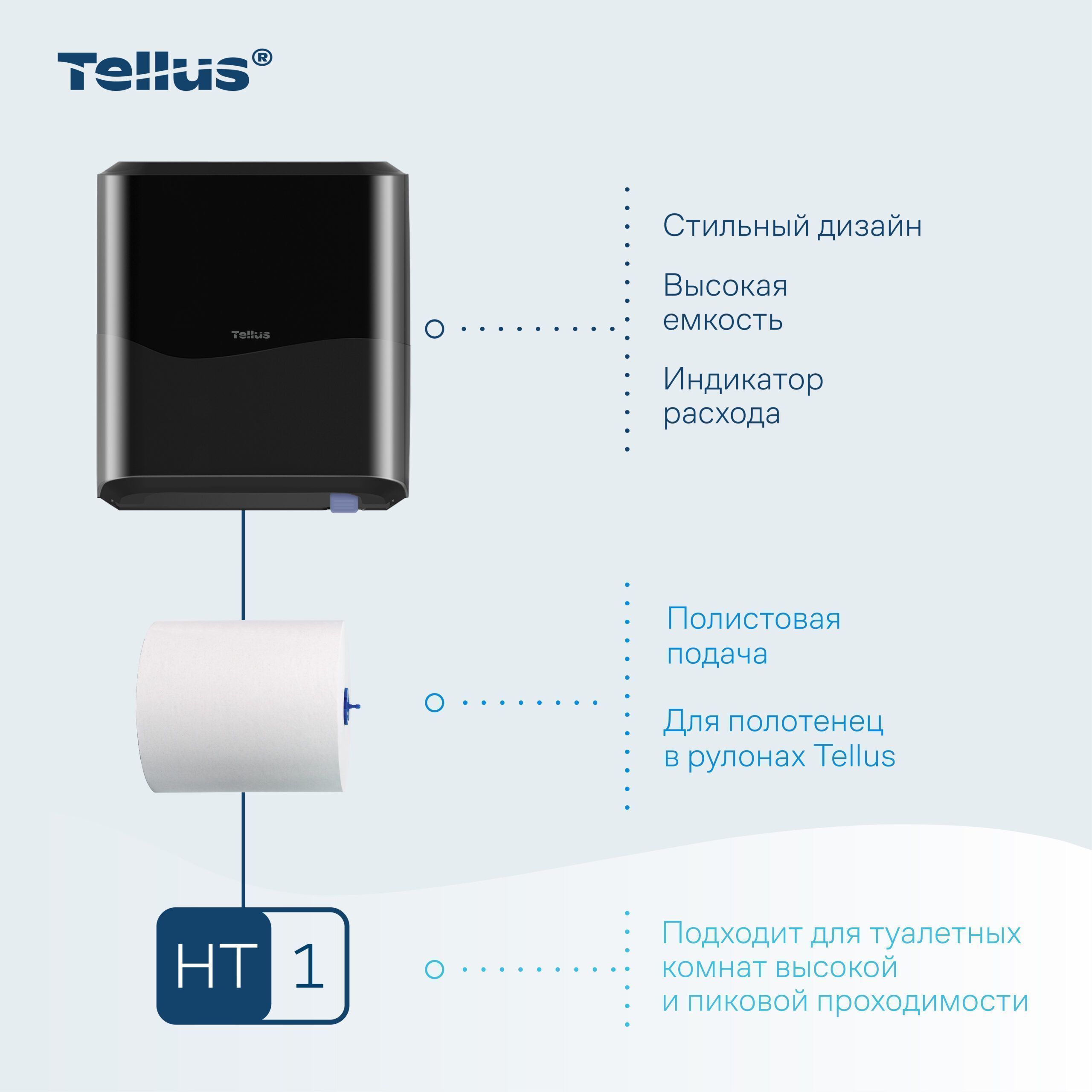 Диспенсер Tellus Matic Solution® в черном исполнении представляет собой современное и надежное решение для организации гигиеничного использования бумажных полотенец в рулонах. Модель идеально подходит для туалетных комнат с низкой и средней проходимостью, обеспечивая чистоту и порядок, а также удобство и комфорт для посетителей.