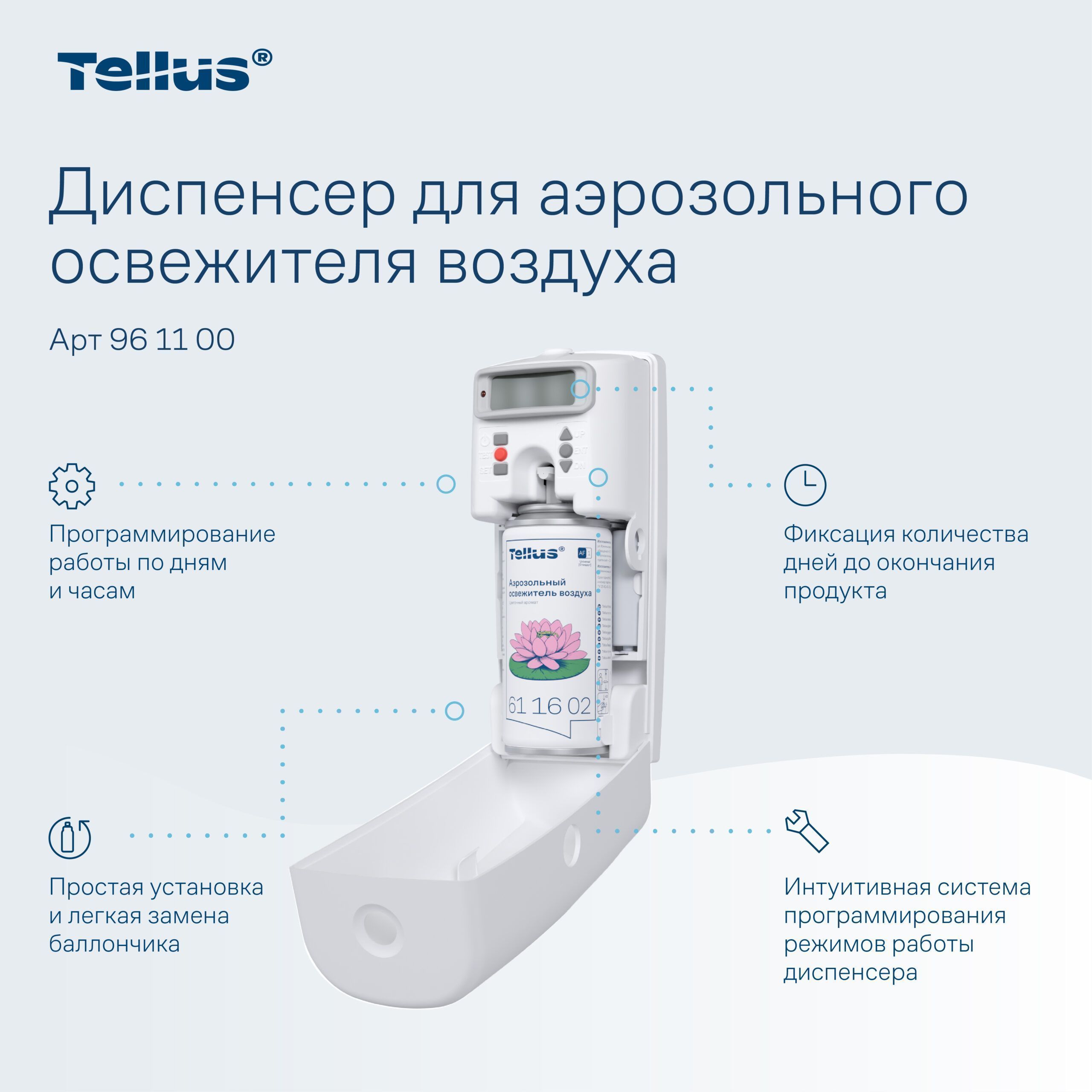 Автоматический диспенсер Tellus 961100 — это сочетание простоты, надежности, функциональности и современного дизайна, обеспечивающее комфорт и свежесть в любом помещении.