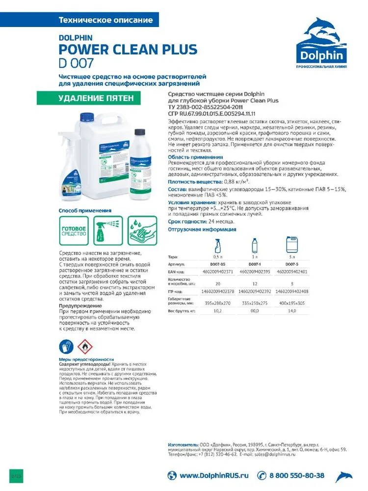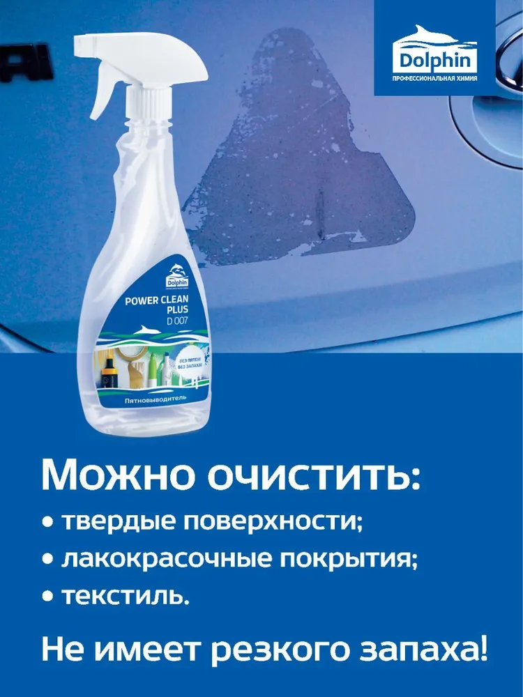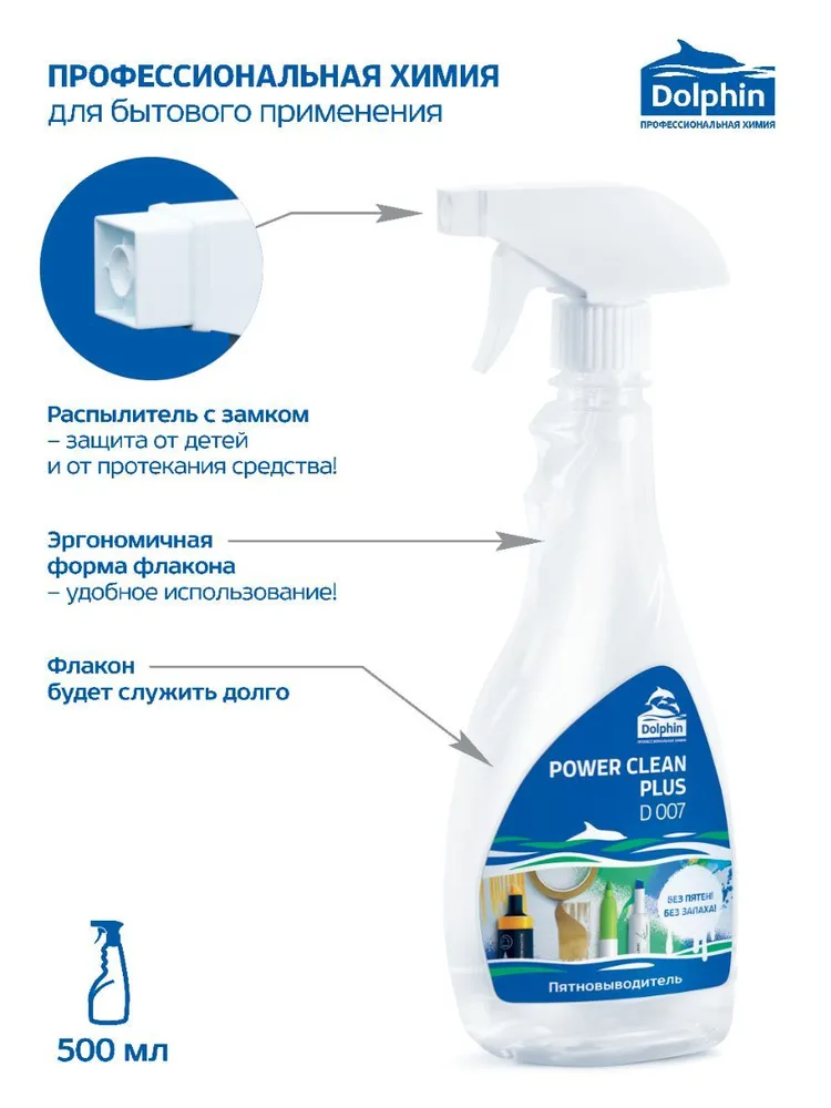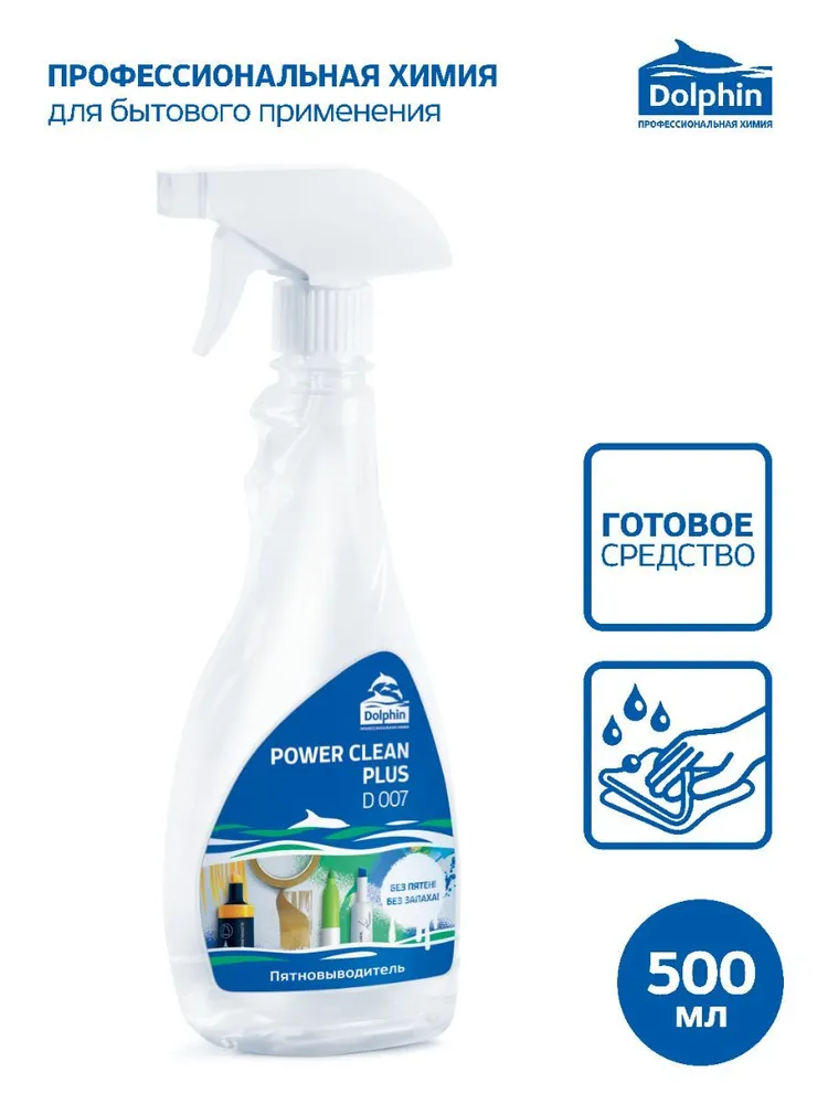 Средство для удаления пятен Dolphin Power Clean Plus 0.5 л D007-05: описание, фото, видео, характеристики, условия доставки и покупки оптом и в розницу, отзывы покупателей. Большой каталог в разделе Моющие средства Dolphin на официальном сайте интернет-магазина дезинфекционного, клинингового оборудования и санитарно–гигиенической продукции simclean.ru