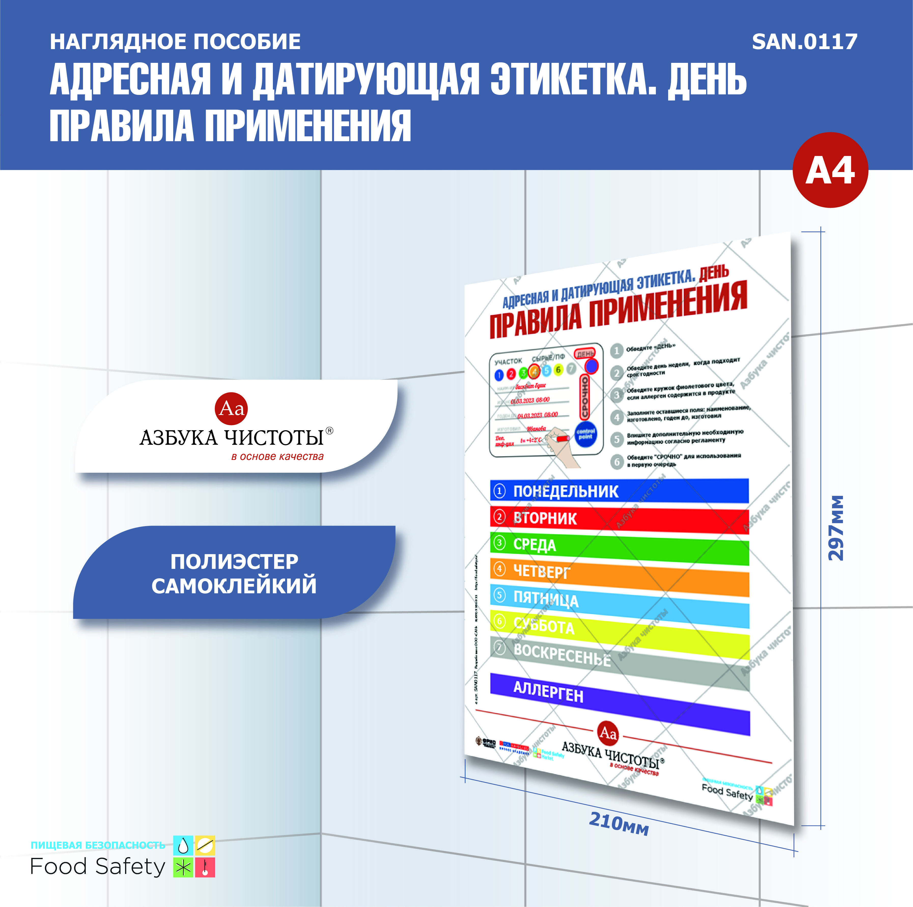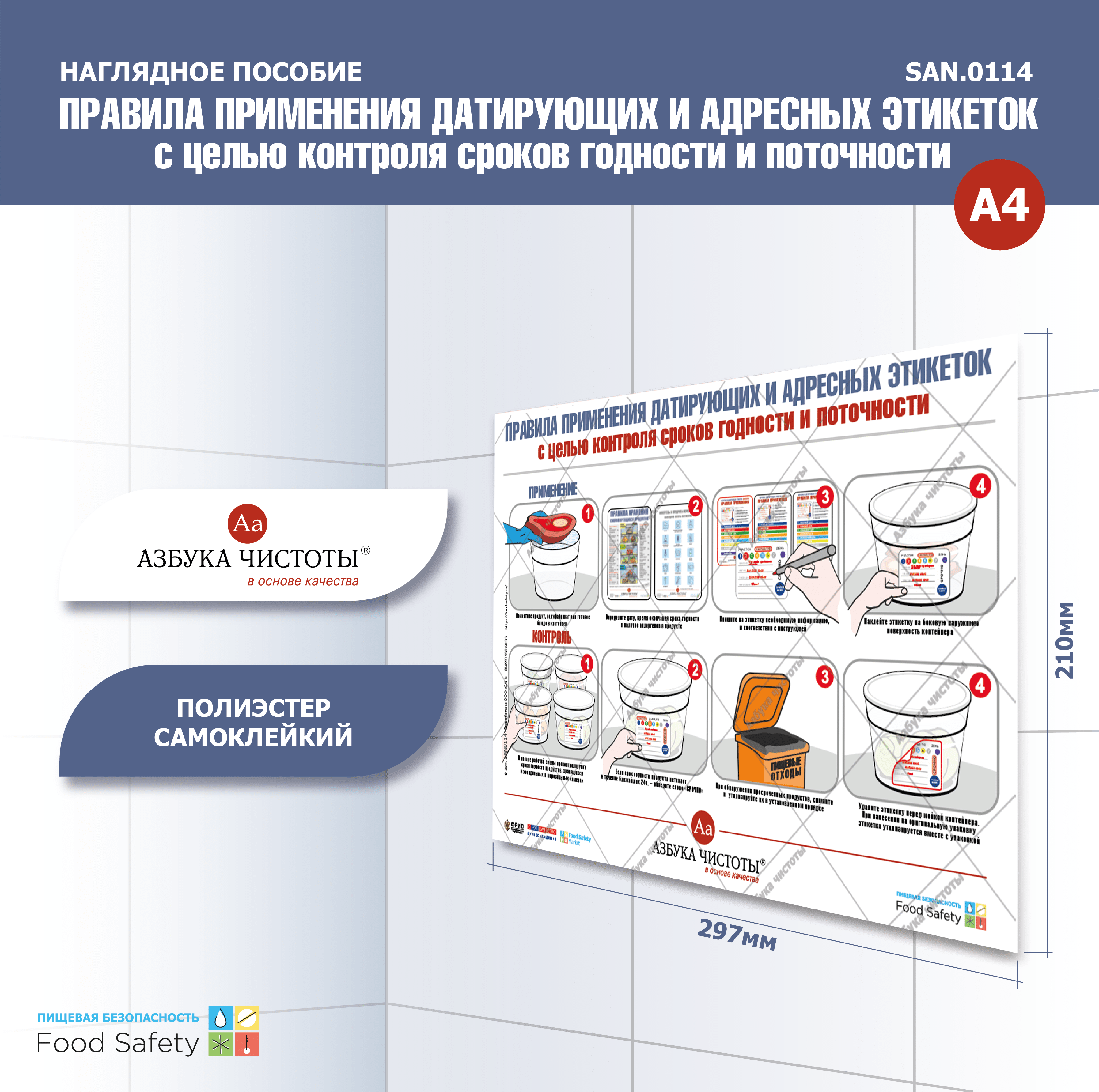 В состав набора входят все необходимые элементы для полноценной организации маркировки: диспенсер, рулон с адресно-датирующими этикетками (арт. 868060) и наглядные пособия по работе с маркировкой (SAN0114-4, SAN0117-4, SAN0115-4, SAN0116-4). Такое решение позволяет внедрить систему контроля сроков годности и движения продуктов без дополнительных расходов на подбор комплектующих.