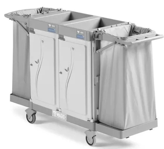 Тележка TTS MAGIC HOTEL 850 SAFETY предназначена для профессиональной уборки и работы горничных в гостиницах, отелях, хостелах, санаториях, больницах и других объектах с повышенными требованиями к организации клининга и безопасности. Модель разработана для эффективной транспортировки чистого и грязного белья, расходных материалов и предметов ухода за номером.