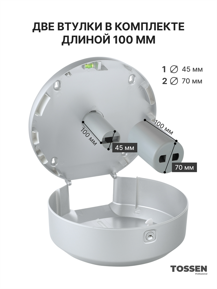 Модель предназначена для использования рулонной туалетной бумаги большого формата. Универсальная конструкция с двумя втулками (45 мм и 70 мм) позволяет использовать различные типы рулонов. Смотровое окошко обеспечивает удобный контроль наличия бумаги, а замок с ключом защищает расходные материалы от несанкционированного доступа.