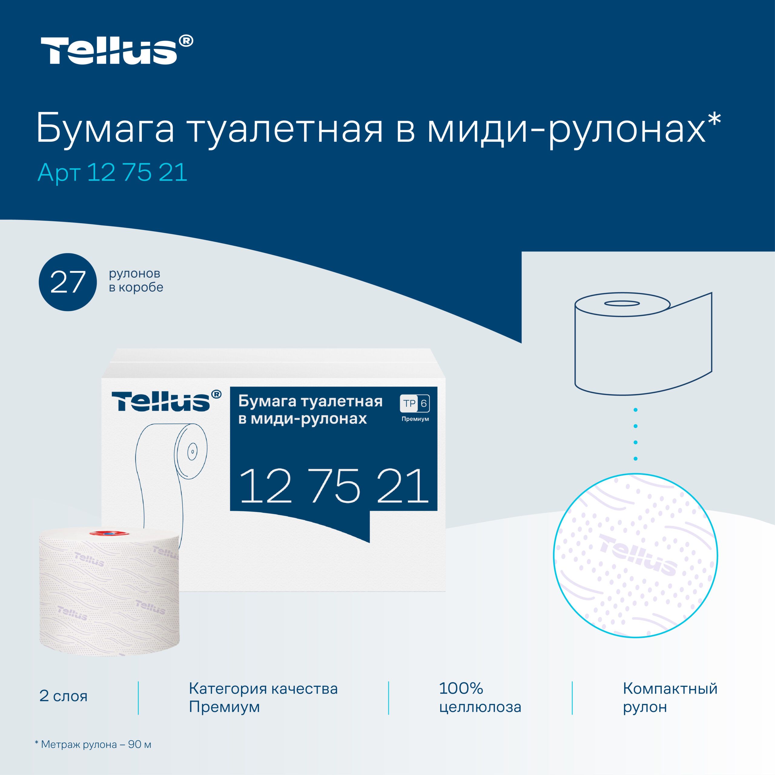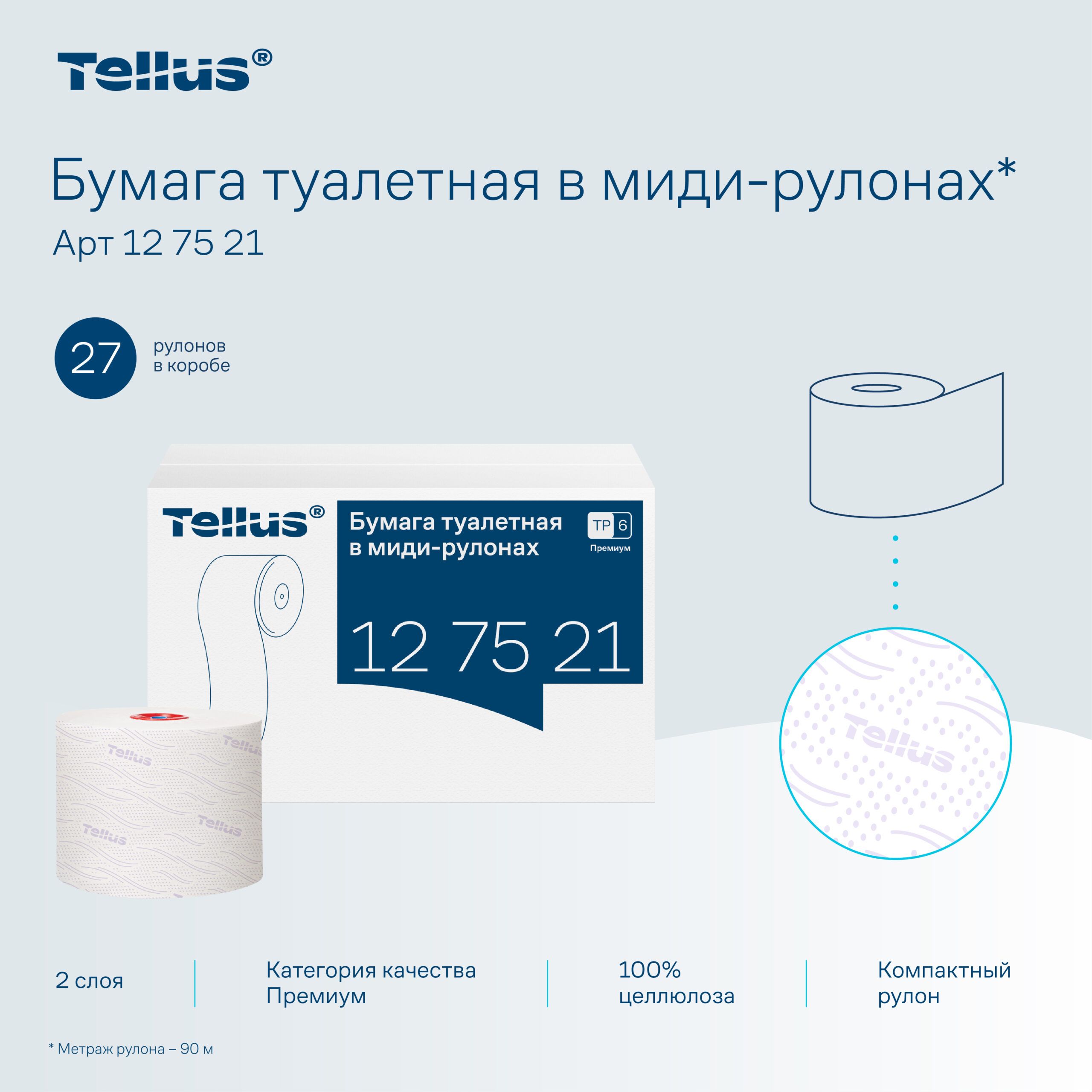 Туалетная бумага в миди рулонах Tellus Premium, 2 слоя, 90 м — система T6, артикул 127521