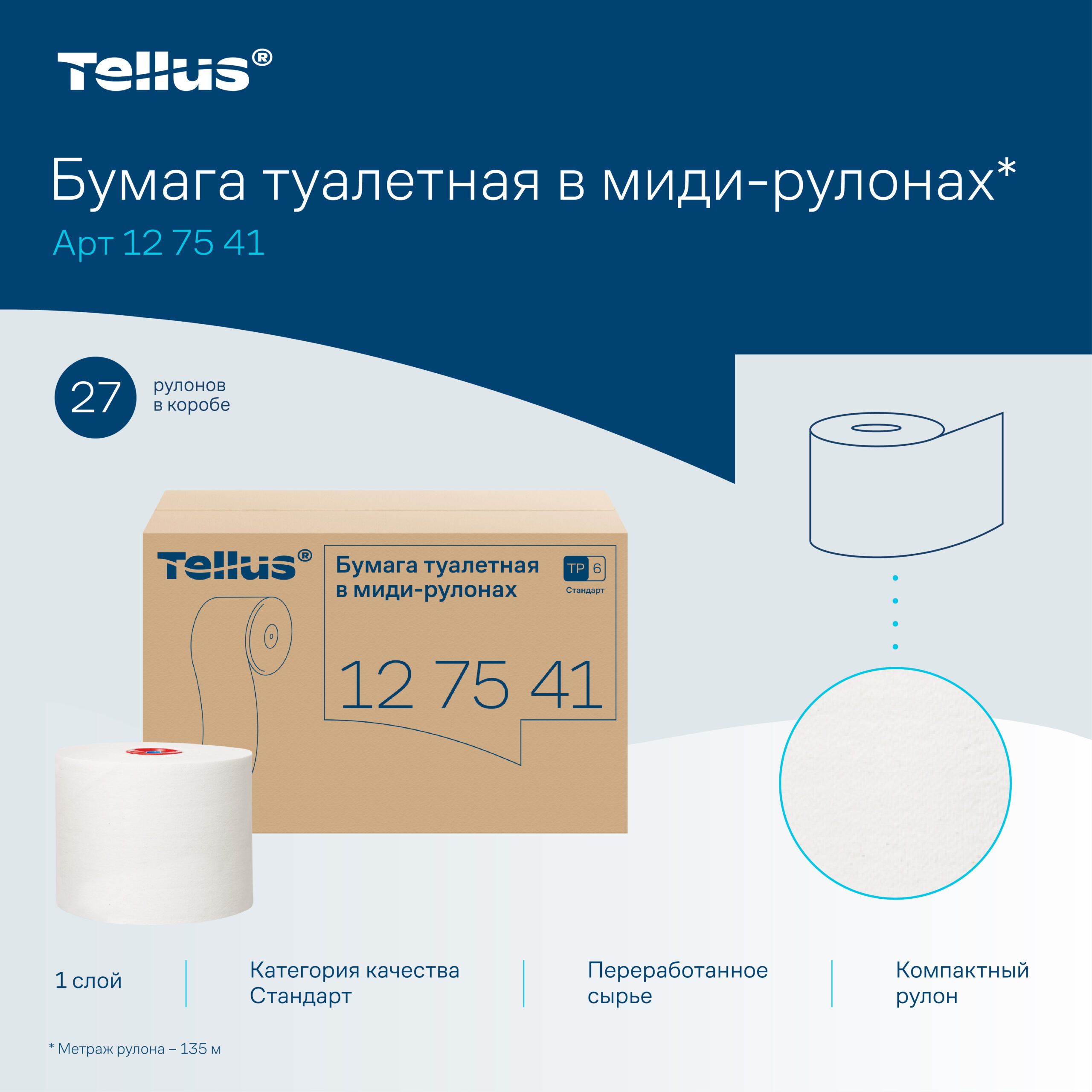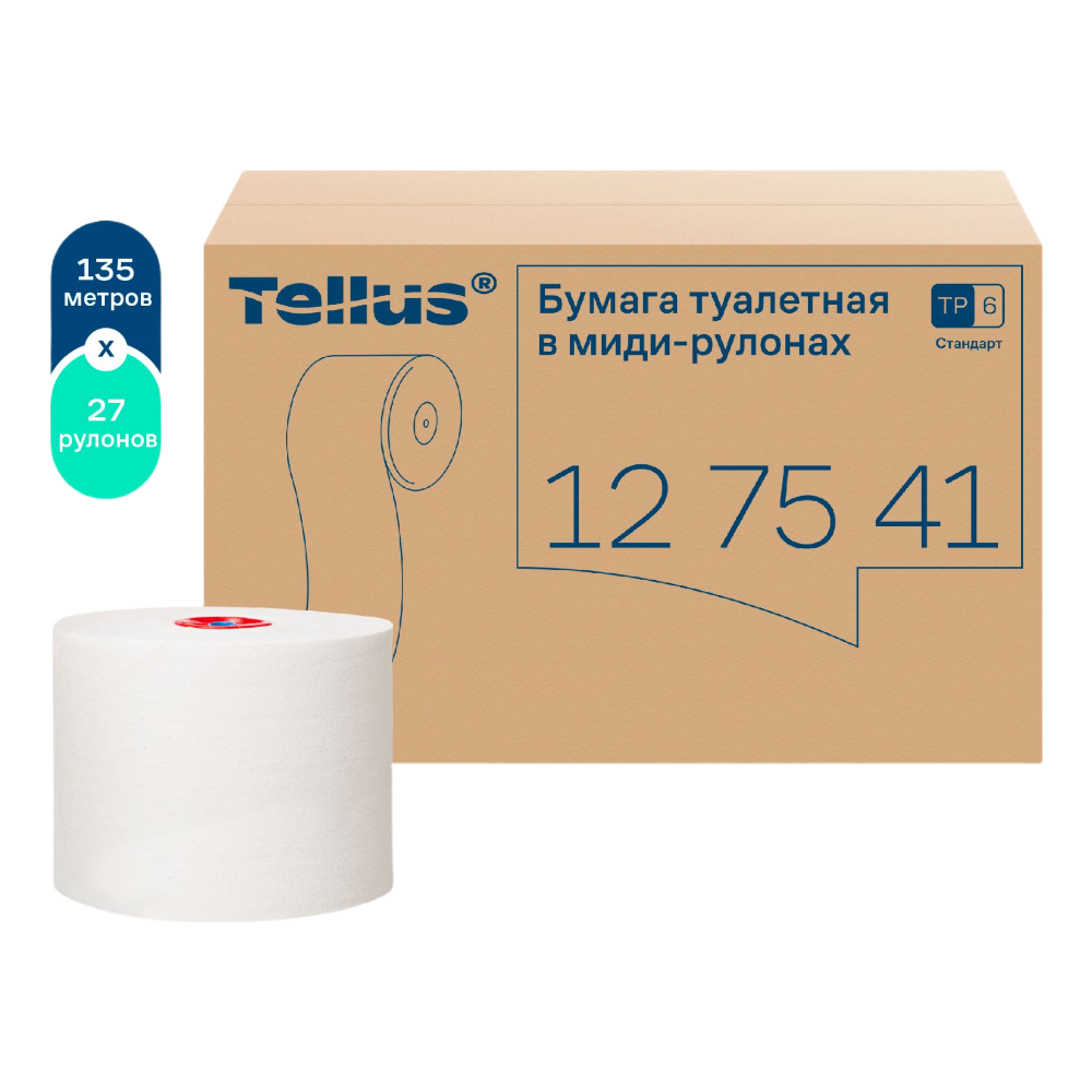 Туалетная бумага в миди рулонах Tellus (Tork) Стандарт 2 слоя 135 м T6, арт. 127541